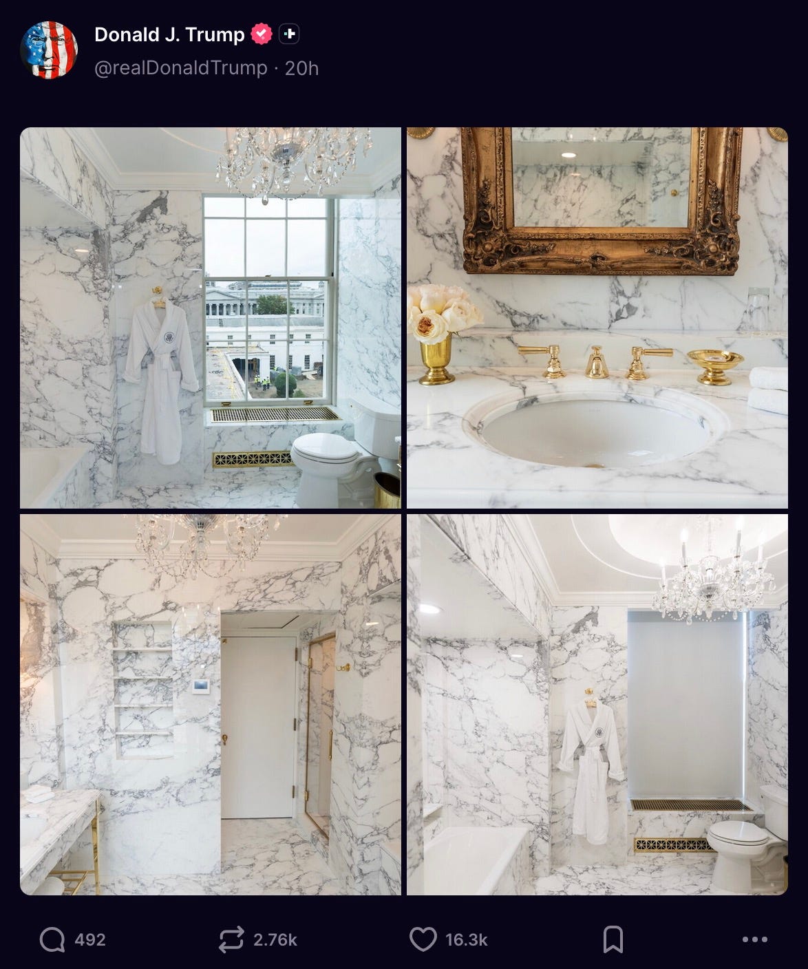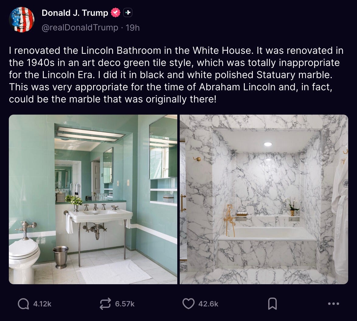 on Friday — while millions of Americans were going without paychecks, wondering how they were going to pay their skyrocketing insurance premiums, and struggling to feed their families — some fucking idiot bragged about having inflicted his terminally vulgar lack of taste onto the White House’s Lincoln Bathroom.