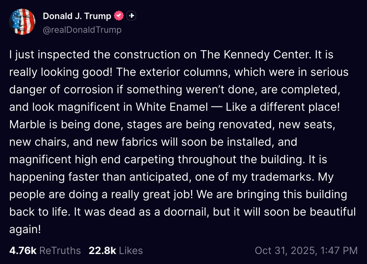 the fucking idiot then bragged about whatever hellscape abominations he’s bringing to bear on the Kennedy Center.