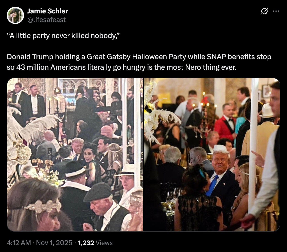 because nothing says ‘I’m an unfeeling, out-of-touch fuckwit’ more than throwing some gaudy gala for your plutocrat cronies, while millions of Americans are going without paychecks and struggling to feed their families.