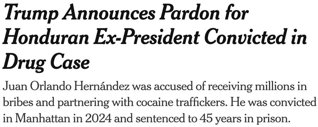 Jeff I gotta tell you I’m simply baffled how the former Honduran president, drug trafficker, used his military to smuggle more than 400 kilos of cocaine obtained a pardon after a jury convicted him.. of course one could say that Blondi Bondi’s brother, also an attorney, received money from this convicts family, passed it to Bondi who recommended a pardon.. and of course Donald gets a piece of the action.. OG mobsters call it “dipping your beak”.. I call it a series of corruption. Best to All