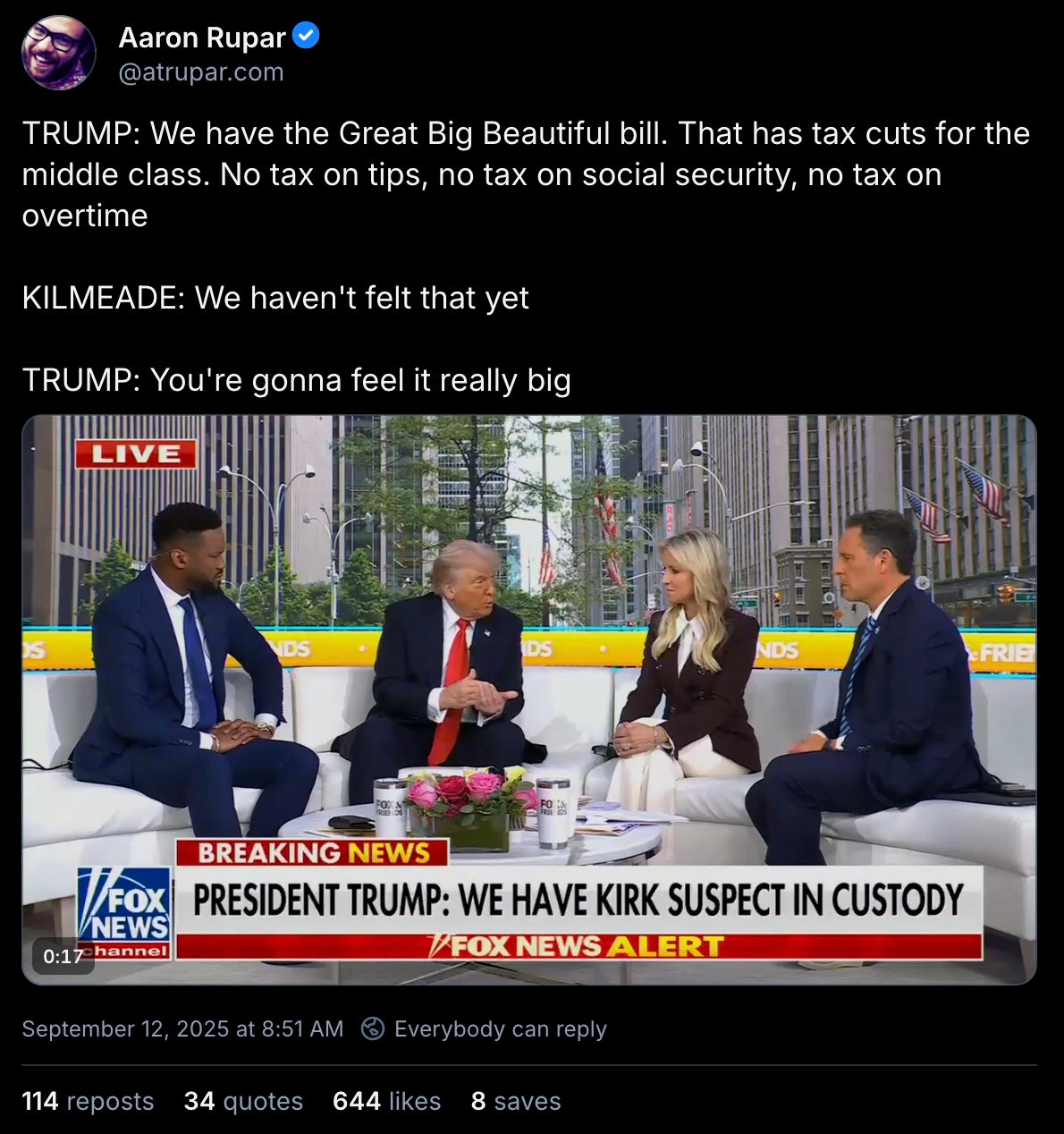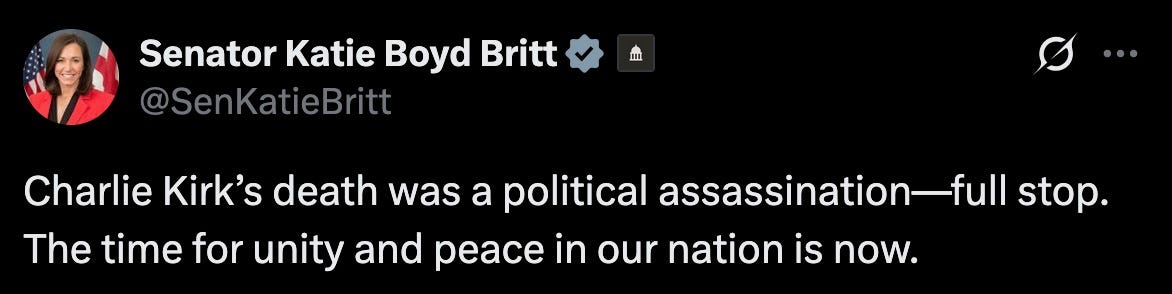 fast-forward to this week. in the wake of Charlie Kirk’s death, Katie Britt’s was one of the few voices on the right who actually called for peace and unity.