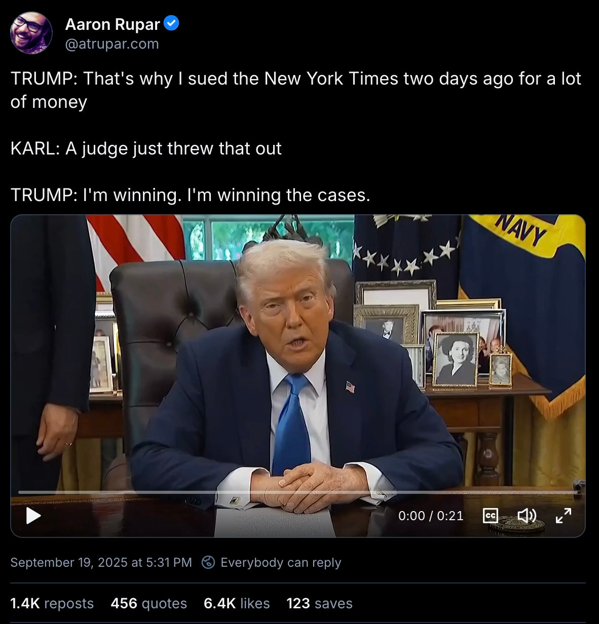 some fucking idiot’s day started off badly, with a judge throwing out his ludicrous $15 billion lawsuit against The New York Times. no, wait — the judge didn’t just throw it out, he laughed it out.