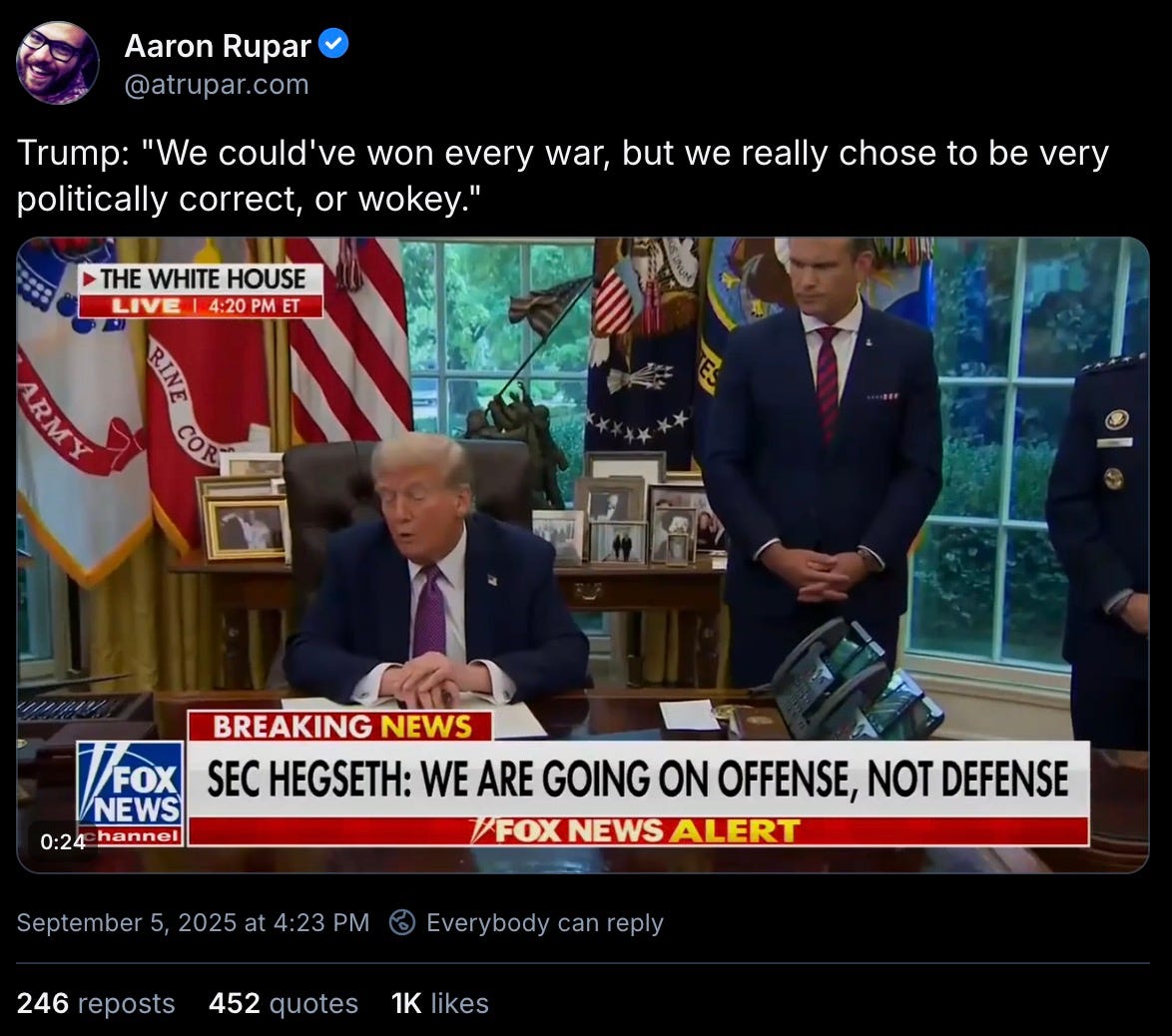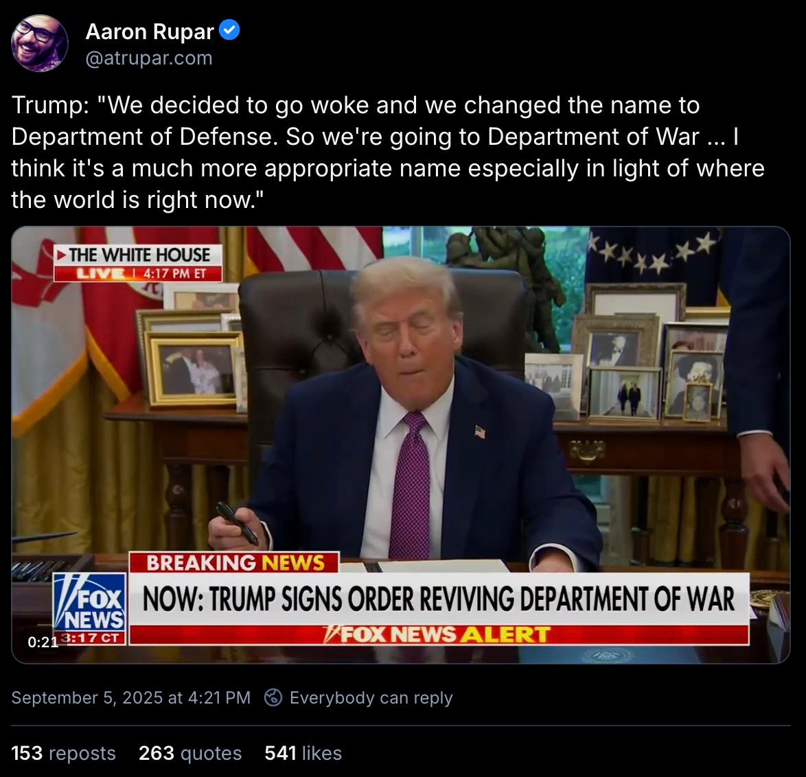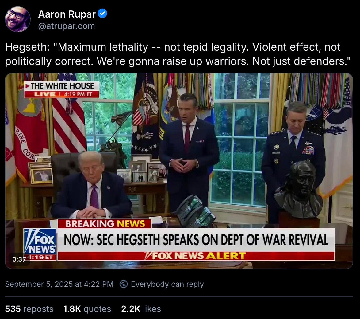 some fucking idiot held a press conference on Friday, during which he and his piss-drunk dunk-tank-clown bestie announced that they were changing the name of the Department of Defense to the Department of War — as one does when you’re thirsty for a Nobel Peace Prize.