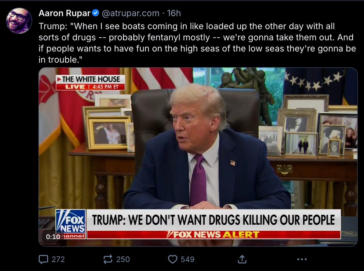 the fucking idiot then bragged about his fuckity-bye-ing of eleven Venezuelan civilians, who Donny eighty-sixed because he had a feeling that they might be doing crimes.