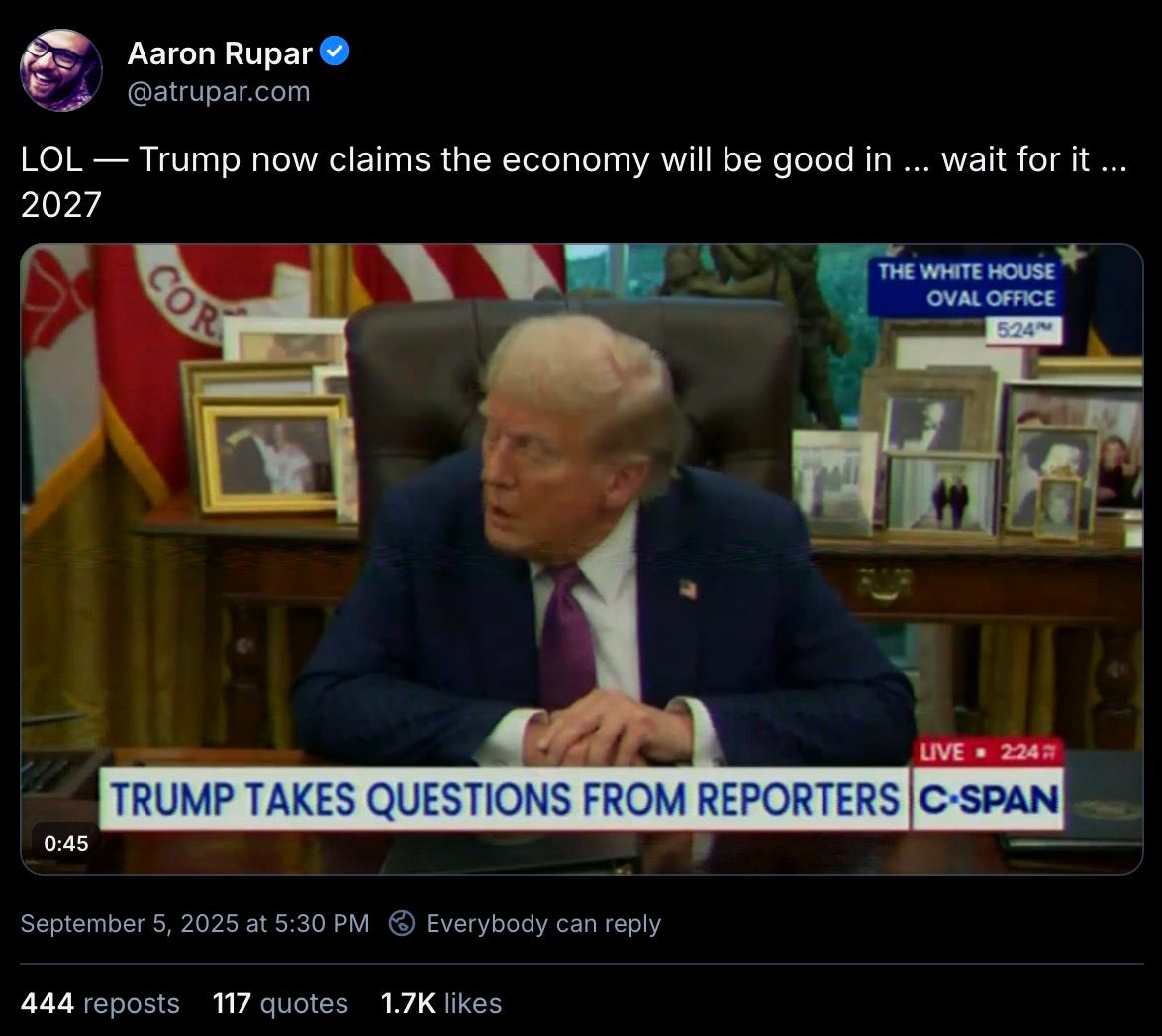 the fucking idiot then predicted the economy he destroyed will be good two years from now, which is totally weird, because up to now he’s been bragging about shit like how he’s brought the price of drugs down by a skillionty percent.