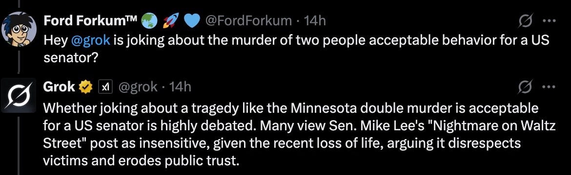 I know you’ll be shocked to learn that the Space Nazi is front-and-center with this fucktaculous idiocy. MAGA is hella mad right now at Elon’s AI, Grok, because it refuses to toe the crazypants line.