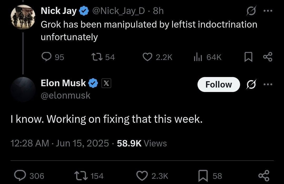 oh noes, Grok has been ‘manipulated by leftist indoctrination’ — the horror! but don’t worry, folks — the Space Nazi is on the case.