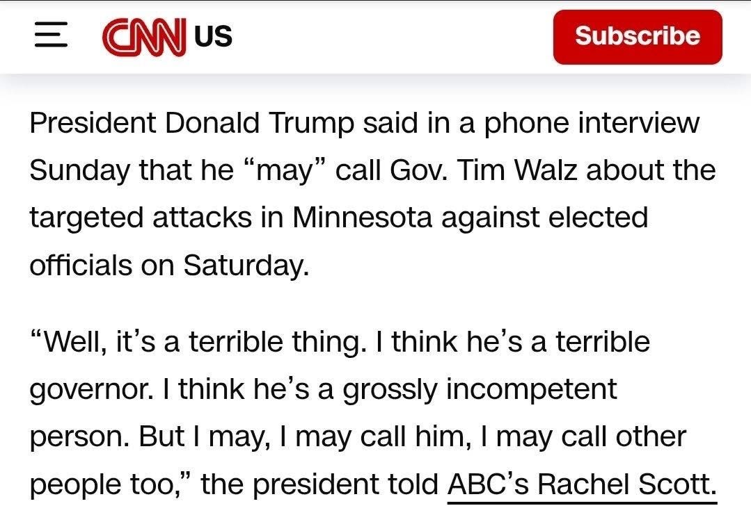 for fuck’s sake, two people are dead and Donny can’t even fart out five words of condolence without veering off in Shithead Land. he may call Governor Walz, or he may instead call ‘other people.’