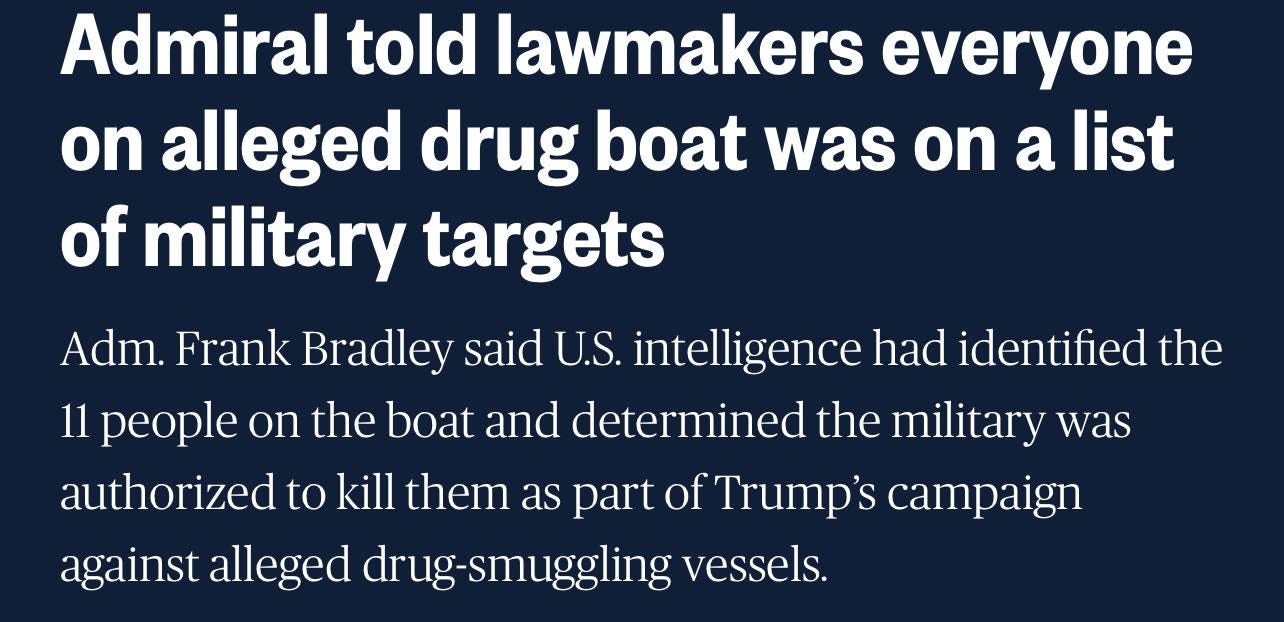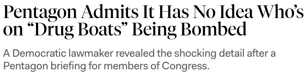 lost in all this smokescreening about ‘were the survivors actually shipwrecked or not’ is that those boats should never have been bombed in the first place. we’ve lost sight of the fact that we are not at war with Venezuela — and these fishing boats are not legitimate military targets.