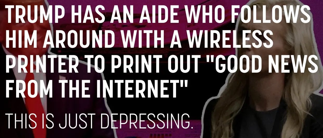 so, that’s a perfectly normal thing, right? seriously, how fucking broken-inside do you have to be to require that kind of nonstop positive affirmation? this big, strong woman, tears in her eyes, actually travels with Donny while he’s cheating at golf, and goes ‘sir! sir! look at the nice thing catturd said about you on twitter! sir!’