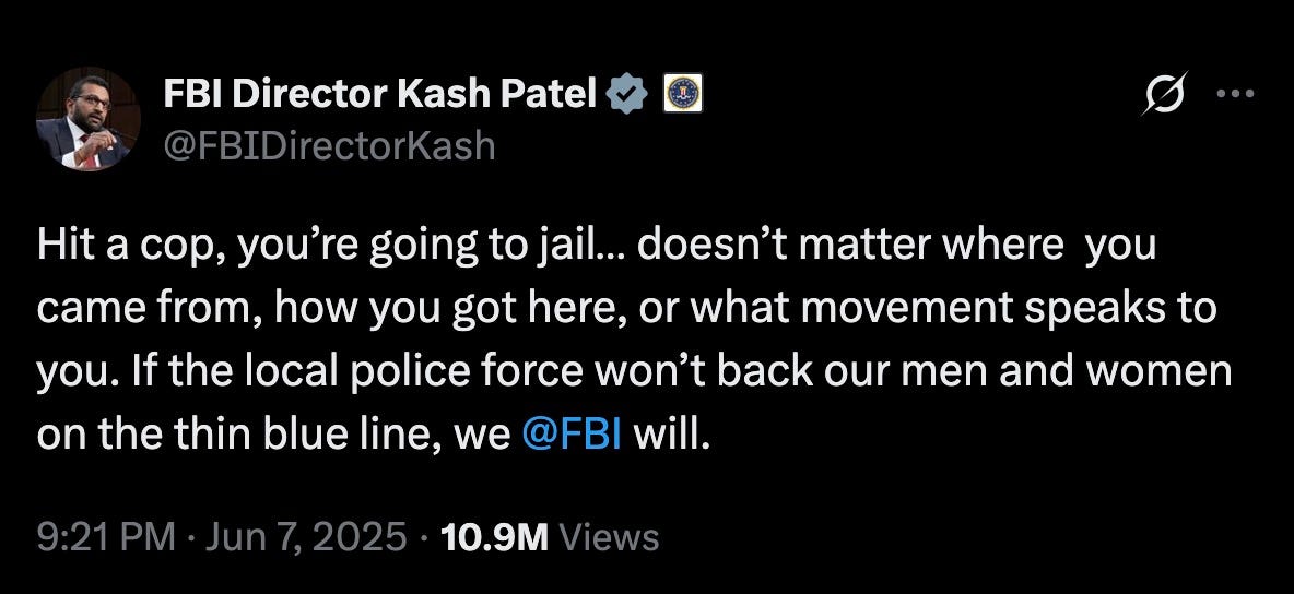 “Hit a cop, you’re going to jail… doesn’t matter where you came from, how you got here, or what movement speaks to you. If the local police force won’t back our men and women on the thin blue line, we will.”