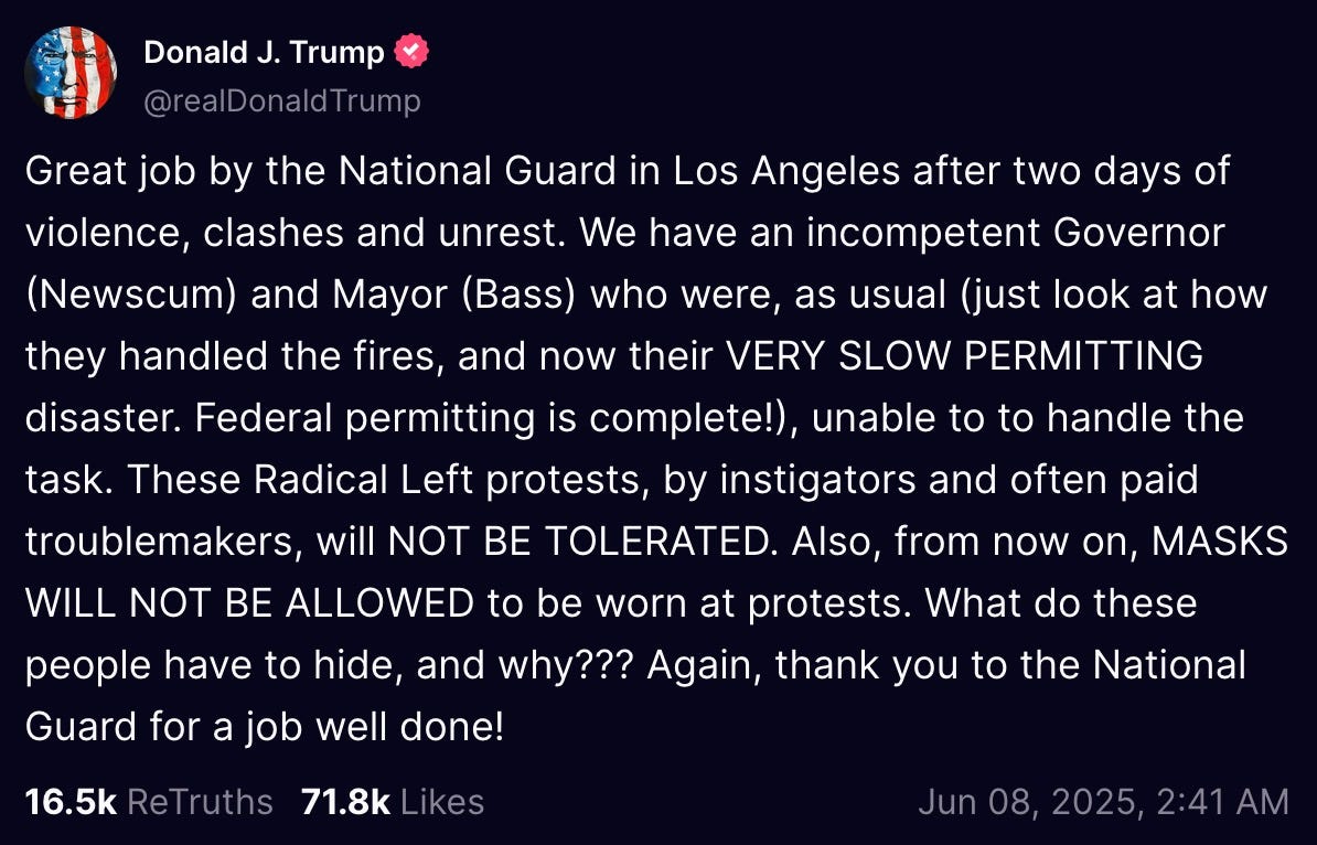 “Great job by the National Guard in Los Angeles after two days of violence, clashes and unrest … Again, thank you to the National Guard for a job well done!”