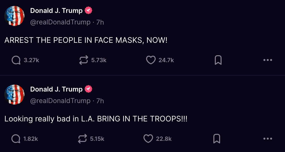 it cannot be stressed enough that Donny posted this about six hours before a single National Guard deployed in Los Angeles.