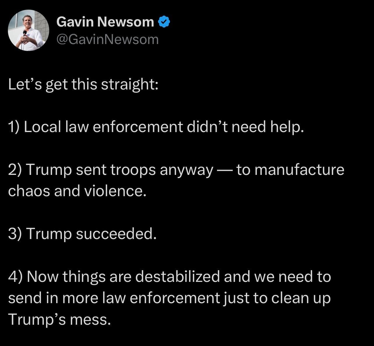 a lot of fucked-up shit went down this weekend in Los Angeles. let’s let California Governor Gavin Newsom sum up perfectly why the blame for all of it needs to land squarely on the Mad King’s shoulders.