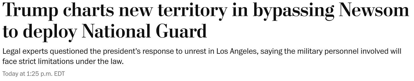 but now, when Dear Leader wants the Guard to patrol California, suddenly states’ rights are no longer an issue, because — well, frankly, I’m having a hard time deciding if it’s because reasons or because fuck you, that’s why. maybe it’s both.