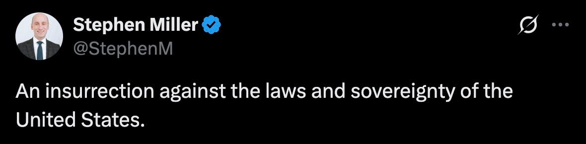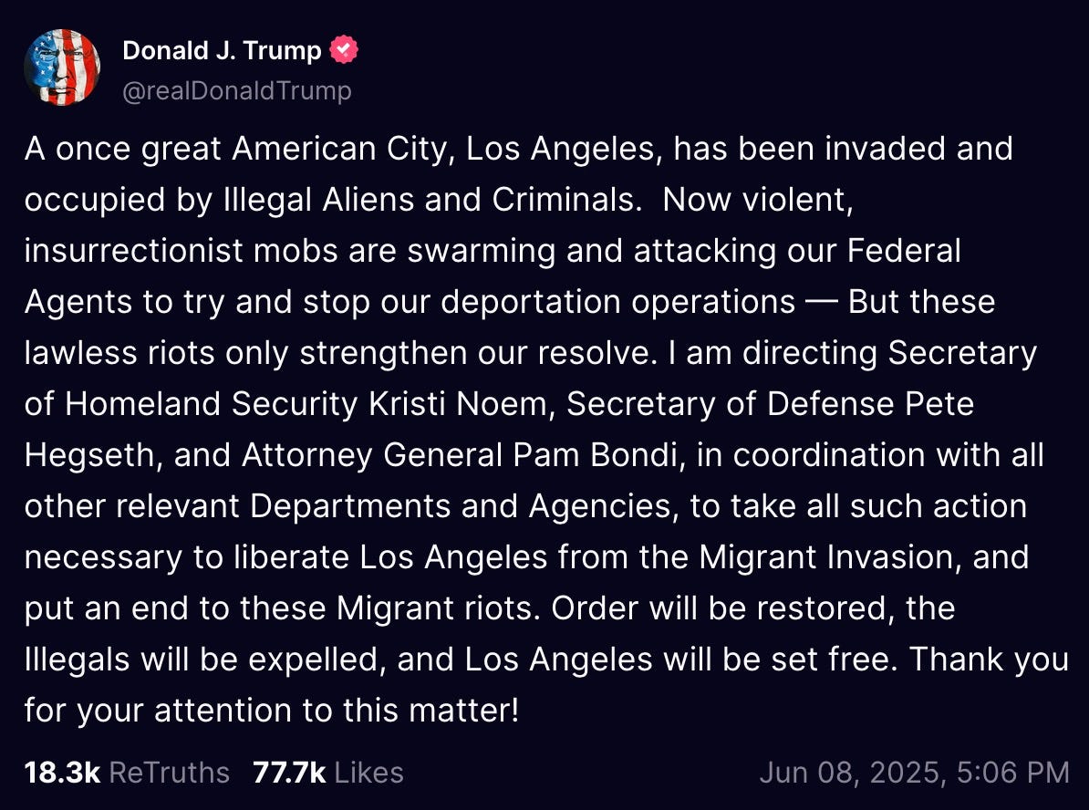 “A once great American City, Los Angeles, has been invaded and occupied by Illegal Aliens and Criminals. Now violent, insurrectionist mobs are swarming and attacking our Federal Agents to try and stop our deportation operations.”