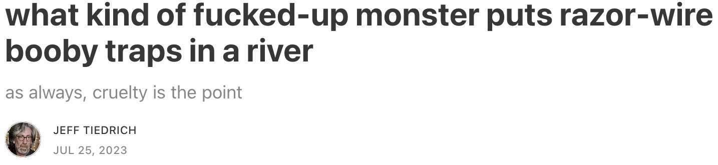 back then, Joe Biden was trying to prevent Texas’ sadistic governor, Greg Abbott, from using razor-wire booby traps to slice the shit out of border-crossing migrants.