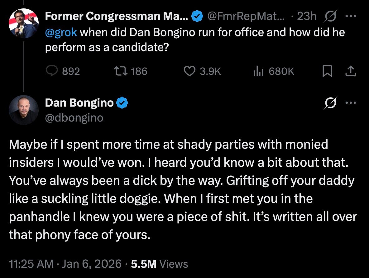 Dan Bingo-Bongo Bongino: “Maybe if I spent more time at shady parties with monied insiders I would’ve won. I heard you’d know a bit about that. You’ve always been a dick by the way. Grifting off your daddy like a suckling little doggie. When I first met you in the panhandle I knew you were a piece of shit. It’s written all over that phony face of yours.”