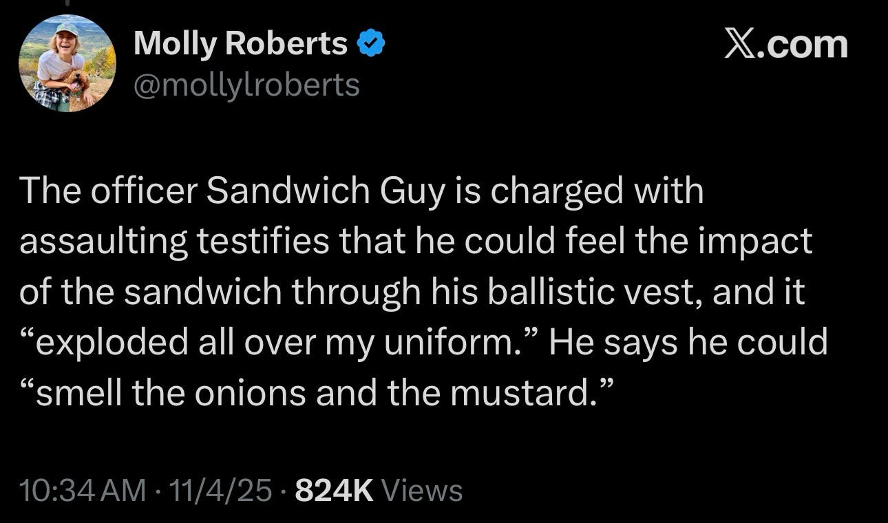 The officer Sandwich Guy is charged with assaulting testifies that he could feel the impact of the sandwich through his ballistic vest, and it “exploded all over my uniform.” He says he could “smell the onions and the mustard.”