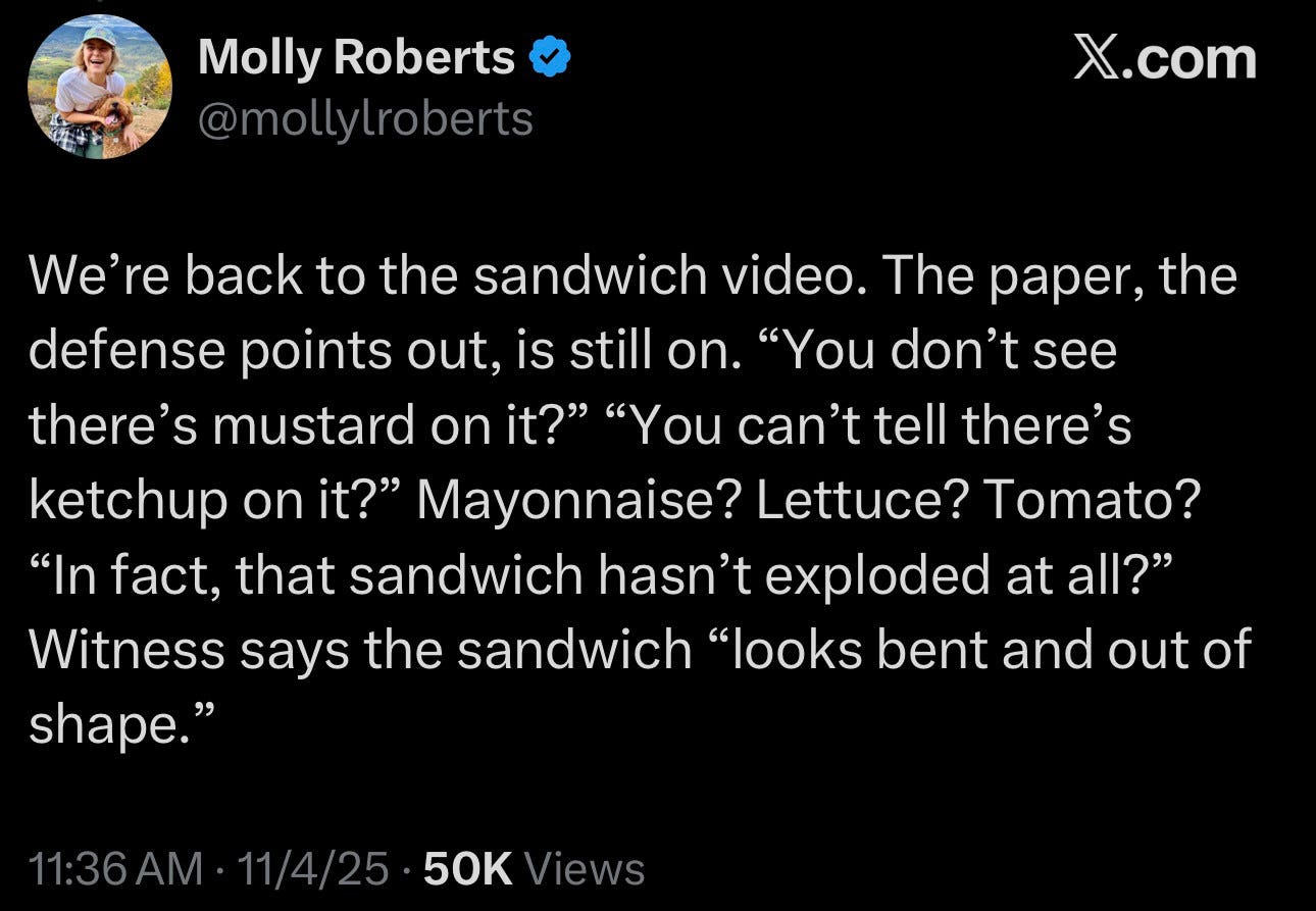 We’re back to the sandwich video. The paper, the defense points out, is still on. “You don’t see there’s mustard on it?” “You can’t tell there’s ketchup on it?” Mayonnaise? Lettuce? Tomato? “In fact, that sandwich hasn’t exploded at all?” Witness says the sandwich “looks bent and out of shape.”