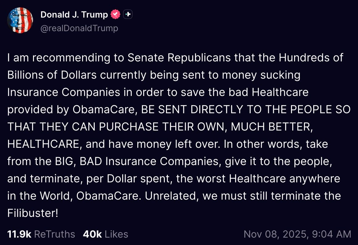 “I am recommending to Senate Republicans that the Hundreds of Billions of Dollars currently being sent to money sucking Insurance Companies in order to save the bad Healthcare provided by ObamaCare, BE SENT DIRECTLY TO THE PEOPLE SO THAT THEY CAN PURCHASE THEIR OWN, MUCH BETTER, HEALTHCARE, and have money left over. In other words, take from the BIG, BAD Insurance Companies, give it to the people, and terminate, per Dollar spent, the worst Healthcare anywhere in the World, ObamaCare. Unrelated, we must still terminate the Filibuster!”