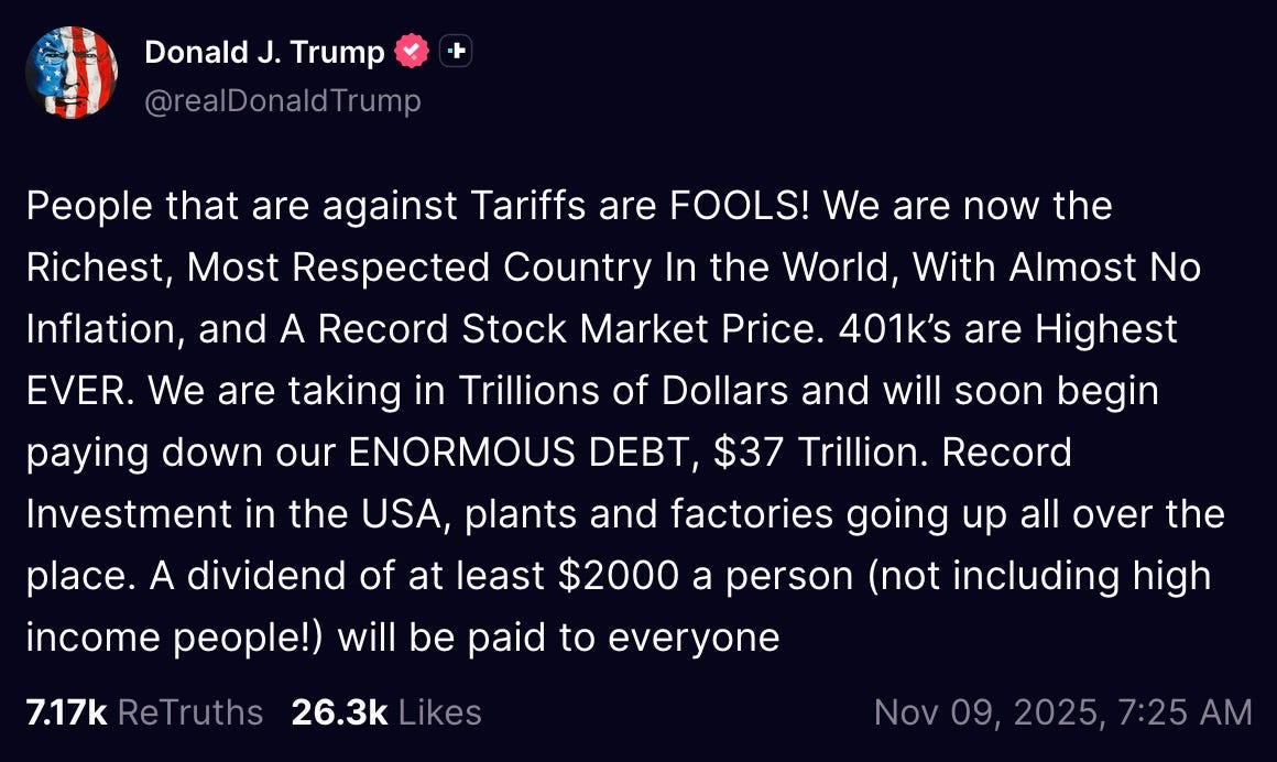 “People that are against Tariffs are FOOLS! We are now the Richest, Most Respected Country In the World, With Almost No Inflation, and A Record Stock Market Price. 401k’s are Highest EVER. We are taking in Trillions of Dollars and will soon begin paying down our ENORMOUS DEBT, $37 Trillion. Record Investment in the USA, plants and factories going up all over the place. A dividend of at least $2000 a person (not including high income people!) will be paid to everyone”