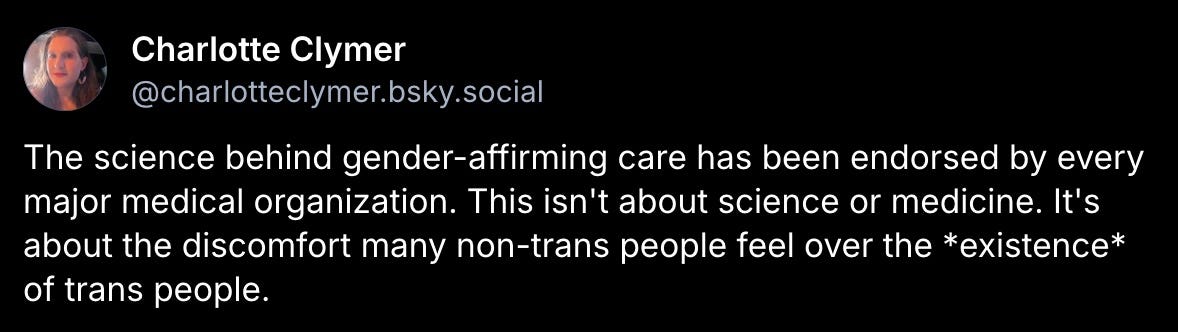 “The science behind gender-affirming care has been endorsed by every major medical organization. This isn’t about science or medicine. It’s about the discomfort many non-trans people feel over the *existence* of trans people.”