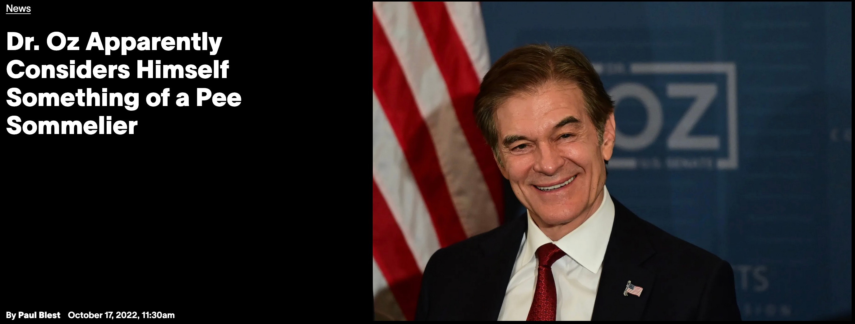 let me highlight just how much we’re being governed by crackpots. here’s a fun fact about Dr. Oz. did you know that he considers himself a bit of a connoisseur when it comes to guzzling piss?