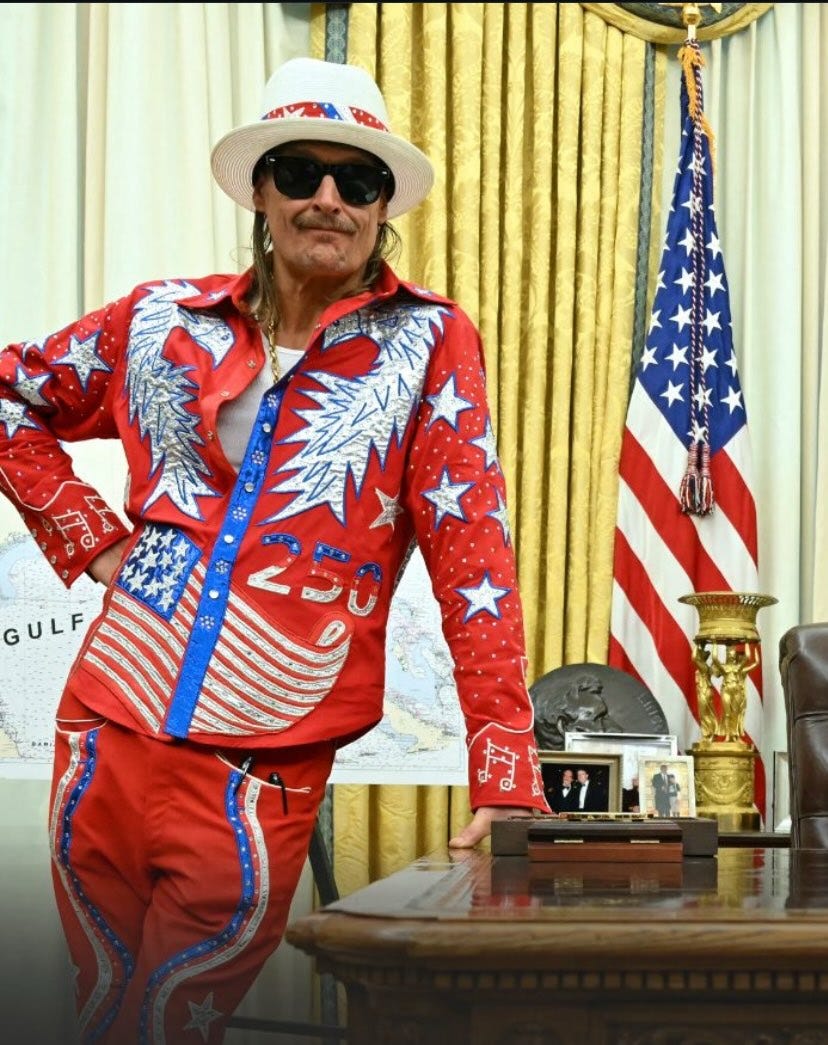 this sartorial nightmare is the 54-year-old No Longer A Kid Rock, the author of hit songs such as … um … I’m sorry, did he ever have one?