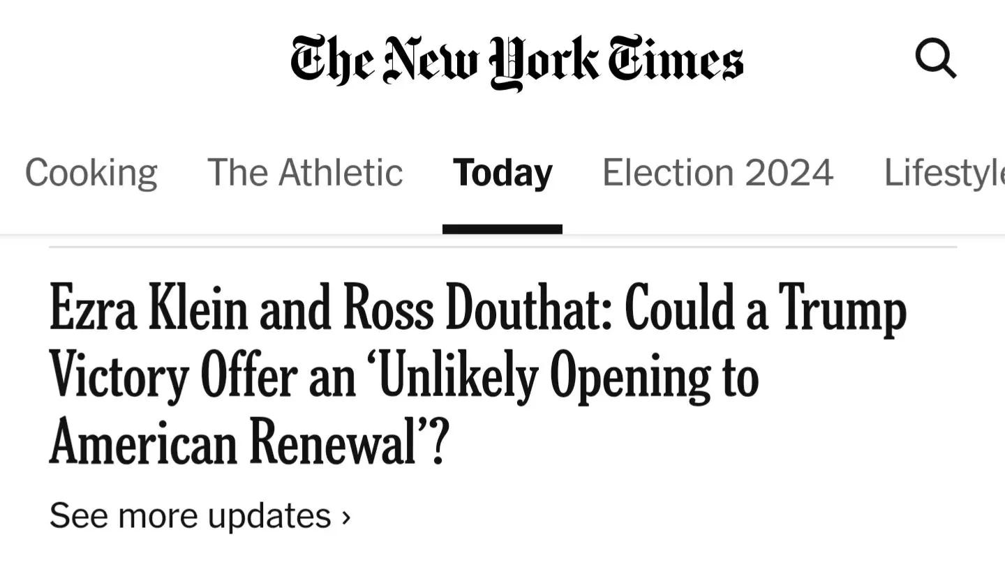exhibit A: the Gas Leak Twins, Ezra Klein and Ross Douthat. here’s the twaddle they shat out onto The New York Times the very day of the 2024 election, just minutes after Donny was declared the victor.